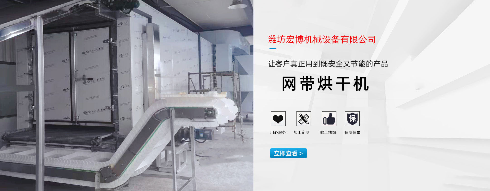 宏博公司主要產品有:網帶烘干機、食品烘干機、滾筒烘干機、隧道窯、烘干箱、燃氣熱風爐、高大車間供暖設備、礦用防爆電加熱器等。